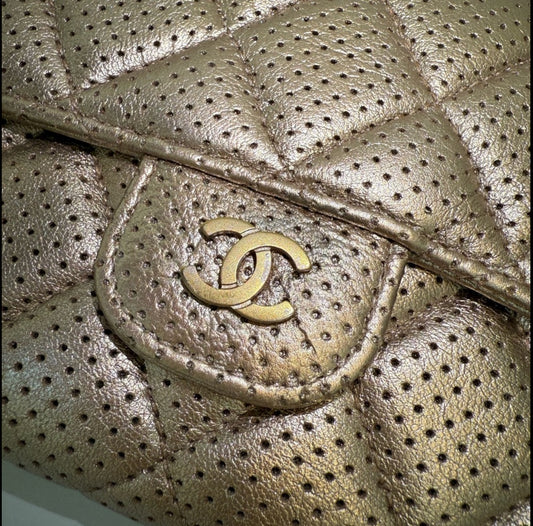 Authentic Chanel CC Quilted Champagne Bifold Perforated Leather Long Flap Wallet