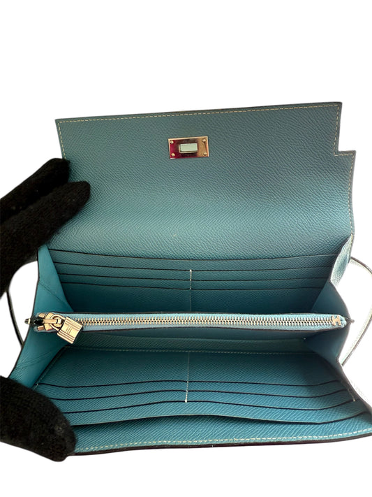 Authentic Hermes Blue Jean Kelly Longue Long Wallet Matching Strap Palladium HW