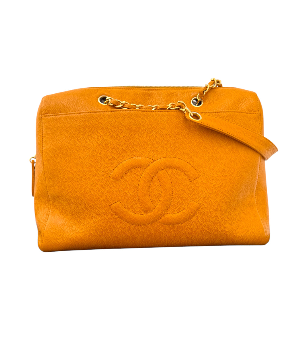 Authentic Chanel Orange Timeless Vintage Caviar Dome Zip Tote Shoulder Bag